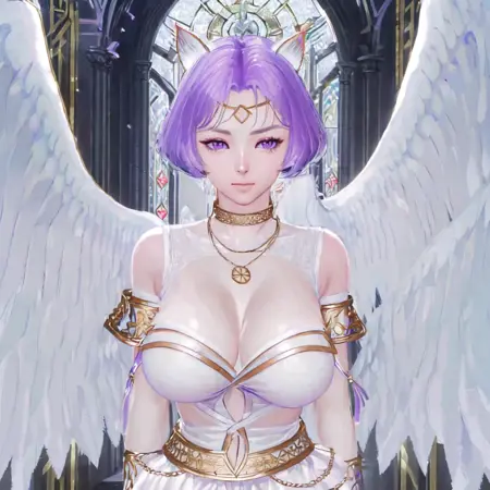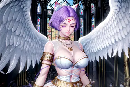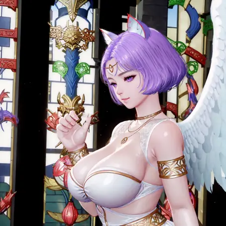 Outfit prompts: necklace, cleavage, jewelry, armlet, bracer, ornament, choker, angel, angel wings, feathered wings, see-through
