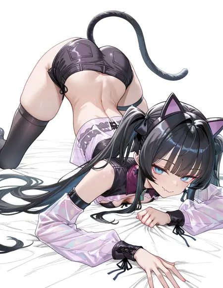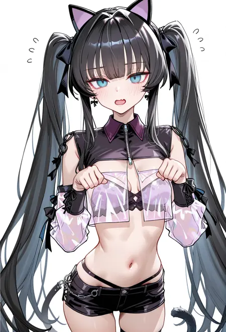 tairitsu neko,animal ears,fake animal ears,cat ears,black hair,long hair,very long hair,twintails,bow,hair bow,white_hair_bow,bangs,blue eyes,earrings,jewelry,fingerless gloves,multiple rings,crop top,breasts,see-through,midriff,see-through sleeves,underwear,cat tail,side_belt,shorts,short shorts,belt,single thighhigh,black thighhighs,