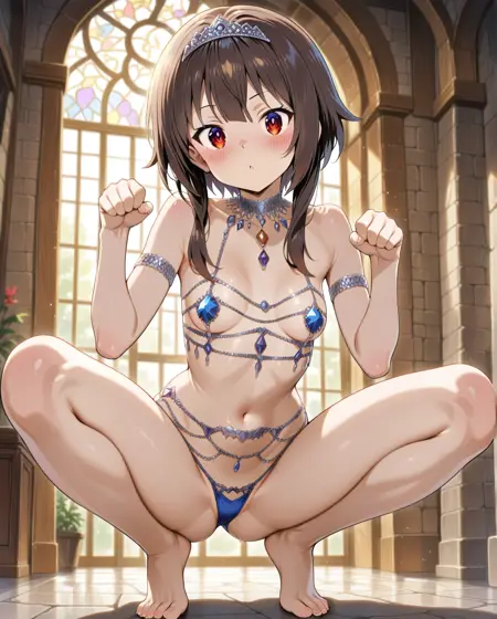 <lora:[Model]:1>, tatsumaki, jewelleryoutfit, 1girl, solo, breasts, looking at viewer, full body, tiara, jewellery pantie, jewellery top, jewellery legwear, jewellery armwear, jewellery high heels, front view, anime, anime colouring,(Optional) => nude