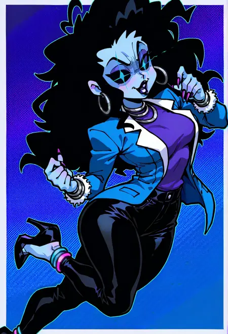 NeoMommyMearest, 1girl, light blue skin, black sclera, light blue glowing eyes, long volumized black hair, black high heels, neon pink hoop earrings, dark purple lips, purple-painted fingernails, blue jacket, purple shirt, black pants