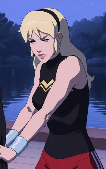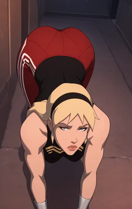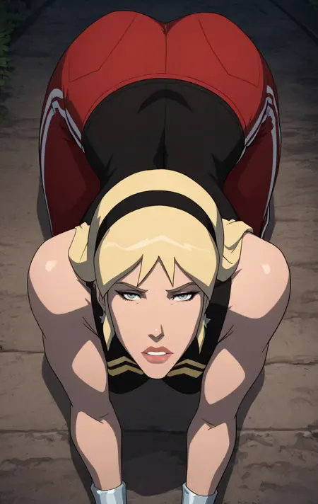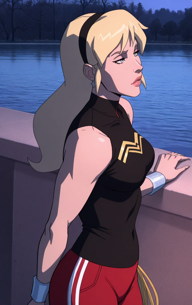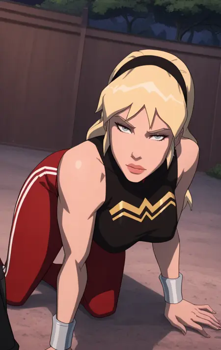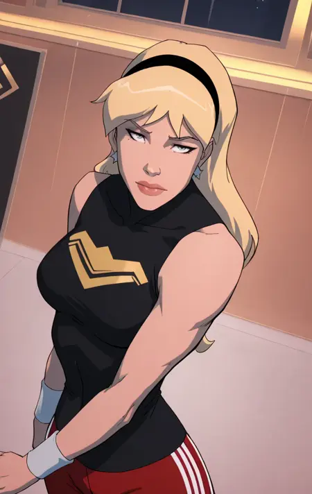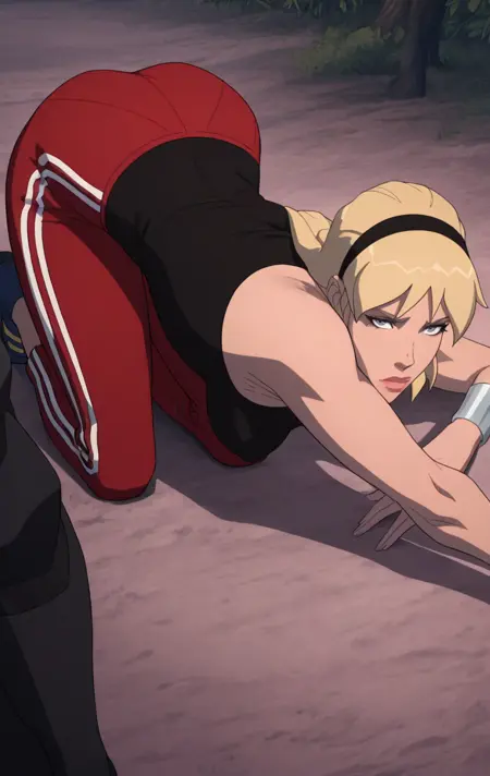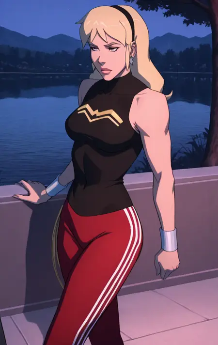 | トレーニングワード | 1girl, solo, long hair, breasts, blonde hair, sleeveless, bare shoulders, medium breasts, full body, yellow hair, ponytail, pants, solo focus, hairband, black shirt, wristband, red pants, blue footwear, black leotard, track pants,g1rlsl,コピーしました! |