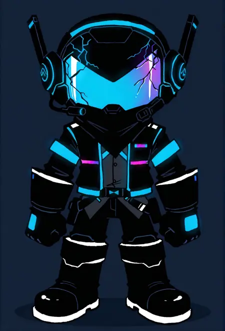 | 학습된 단어 | NeoTankman, 1boy, futuristic black military outfit, cracked magenta-blue visor, sleek modern aesthetic, large black boots, prominent helmet, black bandana around mouth, black jacket, gray shirt, black helmet, black gloves, black pants, short, chibi복사됨! |