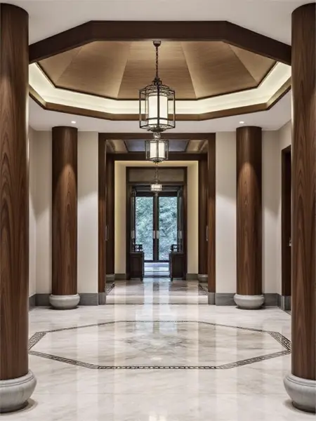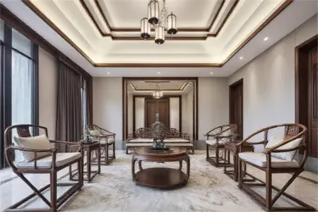 ヒント語:WD、この伝統的な中国風ヴィラは、古典的な要素と現代的な快適さを融合させた設計の傑作です。リビングルームには、温かいハニー色に塗装された、高い木製の梁で構成される天井が広がり、木材の自然な美しさを引き立てています。中央には、黒く磨かれた木で作られた大型の長方形のコーヒーテーブルが置かれ、周囲には深紅のシルクで仕上げられた4脚のエレガントな肘掛け椅子が配置されています。椅子のフレームには、中国神話の情景が繊細に彫刻されています。壁には、真鍮の金具が施された長く低めのサイドボードが設置され、その上には中国の古董陶磁器の花瓶と一対の青銅製の香炉が飾られています。壁には額装された書道の巻物が並び、文化的な優雅さを加えています。大きな木製の格子窓から自然光がたっぷりと差し込み、控えめな金色のシルクカーテンを引けばプライバシーを確保でき、伝統的な中国の美的感覚を称える、居心地の良い温かい空間が完成します。