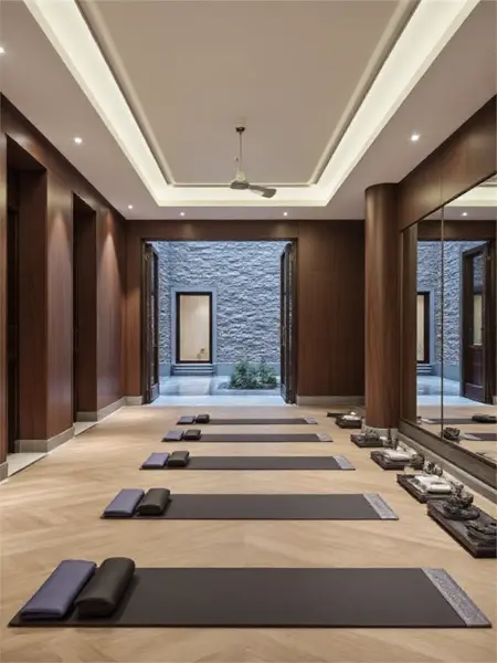 WD、このエレガントな室内ヨガスタジオは、瞑想と身体の練習に最適な広々とした静かな雰囲気を備えています。部屋は柔らかい天井の埋め込み照明によって、落ち着きと集中を促す環境が整えられています。壁には、洗練された濃い色の木製パネリングが施され、空間に洗練さと温かみを加えています。床は研磨された天然木で、ヨガマットを置くのに快適で頑丈な表面を提供しています。床には3枚のヨガマットが整然と並べられ、タオルや水ボトルなどのアクセサリーも近くに配置されています。部屋には、天井から床まで広がる大きな鏡が設置され、空間の広がりを強調するだけでなく、自分の練習を全体的に確認できるようにしています。背景には、大きな窓を通して静かな中庭が見渡せ、自然光が部屋にたっぷりと差し込み、よりいっそう居心地の良い雰囲気を醸し出しています。中庭は伝統的な石造りの建築で、全体の美意識に文化的なエレガントさを加えています。このヨガスタジオは、ヨガや瞑想、その他のマインドフルネス活動に静かでスタイリッシュな空間を求める方々に最適です。現代的なデザイン要素と自然素材の組み合わせが、心地よくリフレッシュできる環境を生み出します。