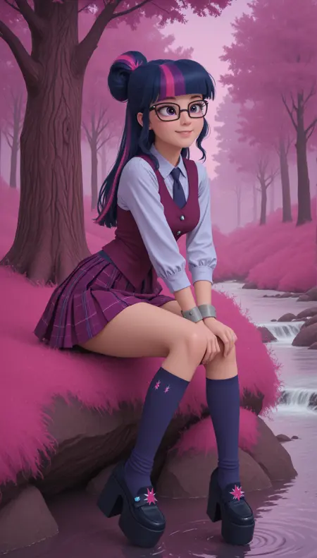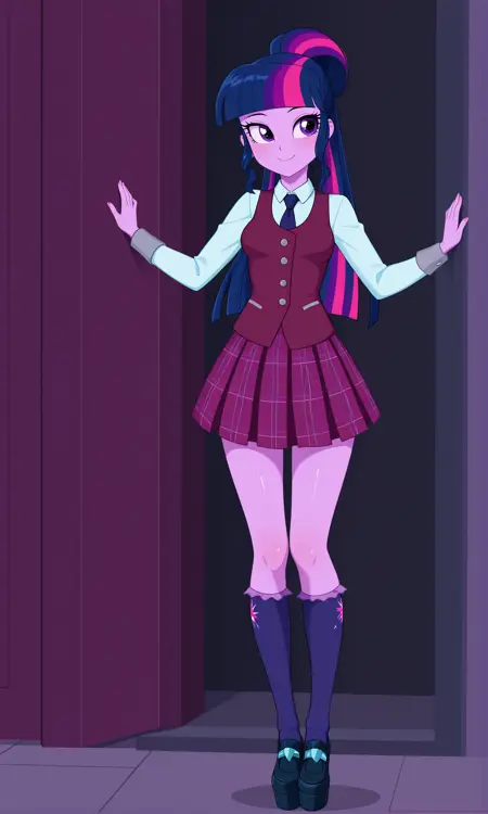 light blue long-sleeved shirt with a maroon vest over it, a navy tie, grey cuffs, a plaid skirt in maroon and purple tones with thin light blue stripes, navy blue knee socks with frills, platform shoes with light blue embellishments.