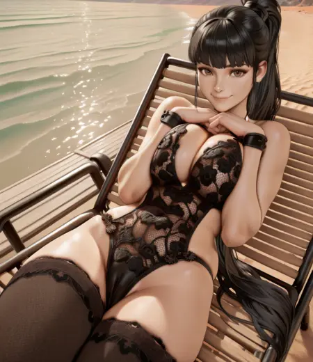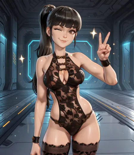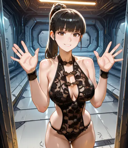 black lingerie, or black leotard, thighighs, wristbands, shoes,