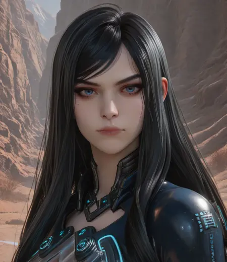 rvensbxl, blue eyes, black hair, long hair, makeup,