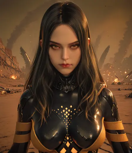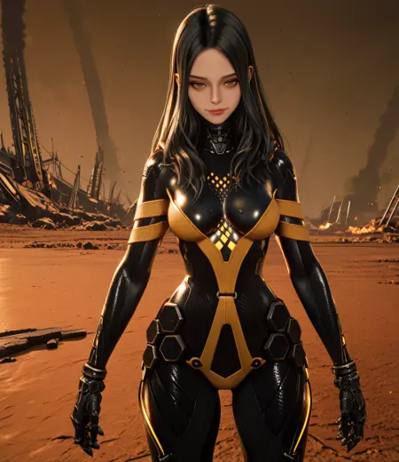 black bodysuit, yellow trim, or orange trim, armor, metal hands, or metal gloves,
