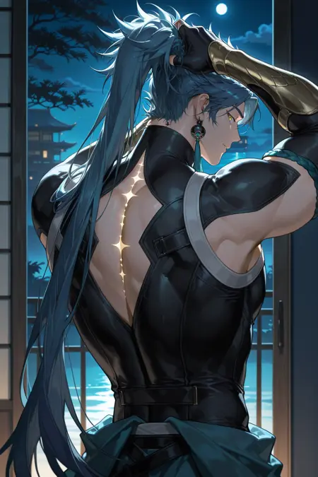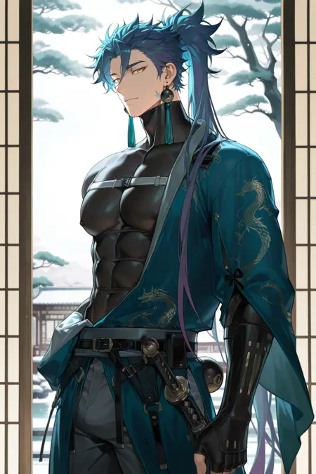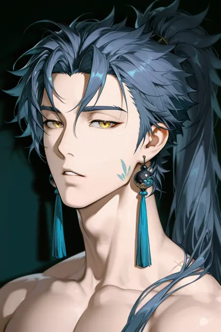 jiyan, 紫色头发,黄色眼睛,脸上有疤痕,马尾辫,长发,流苏耳环