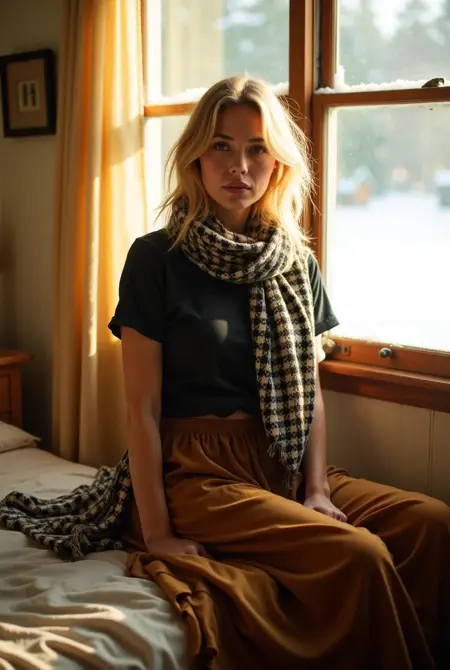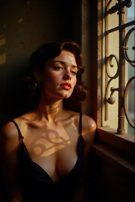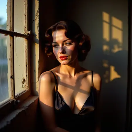 照明(テクニカラーのフィルムが光に反応する方法): ハイキーなスタジオ照明、ツヤのあるハイライト、輝く肌色、ソフトなリムライト、彩度の高いシャドー
