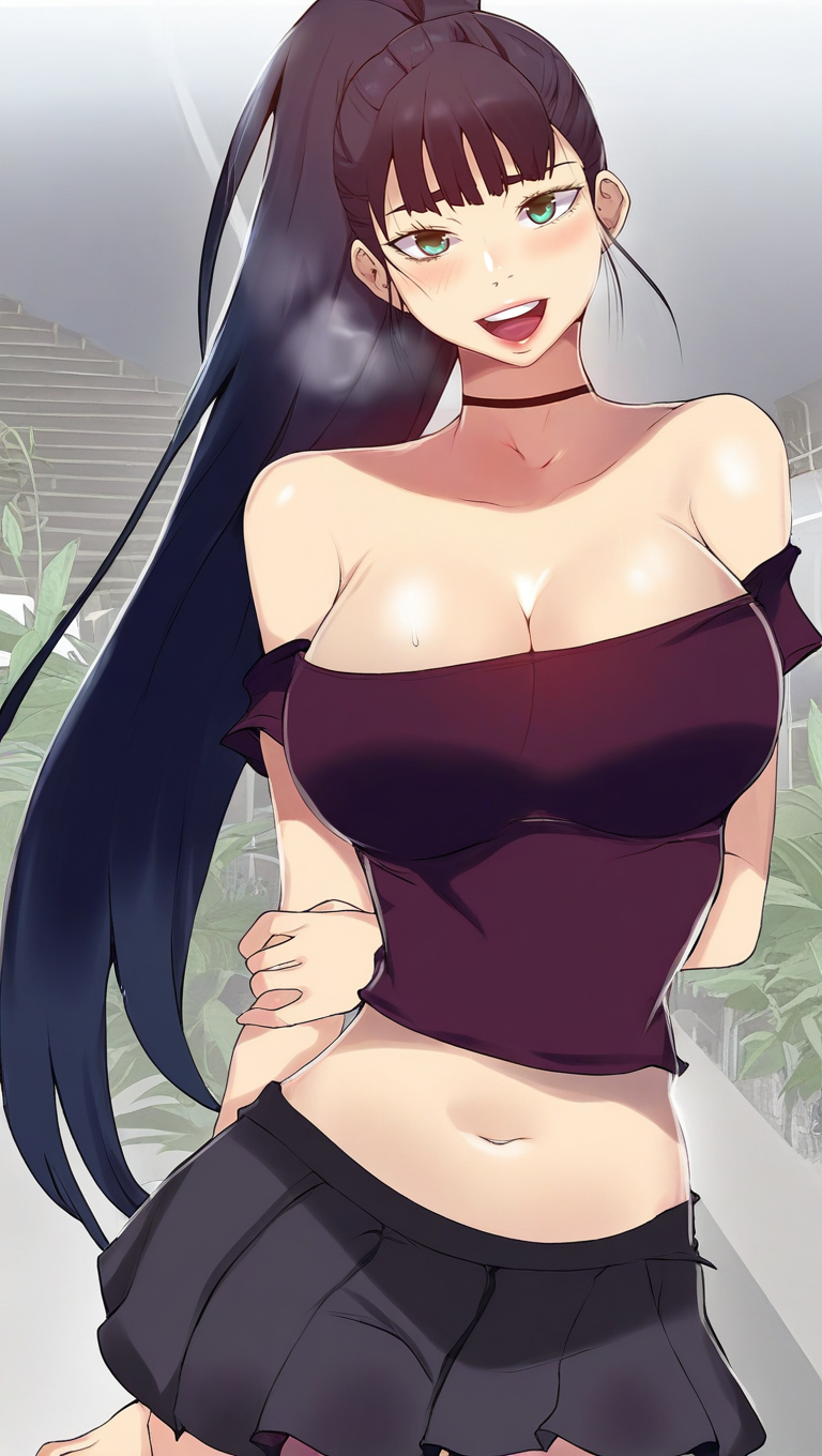 休闲装,红衬衫,露肩,黑裙,短裙,迷你裙,露肩,褶皱裙,项圈,黑色项圈,肚脐,腹部,乳房,大乳房,乳沟,