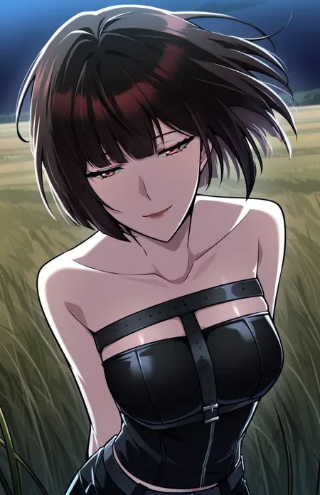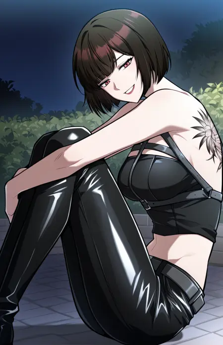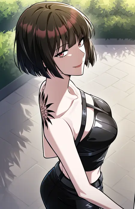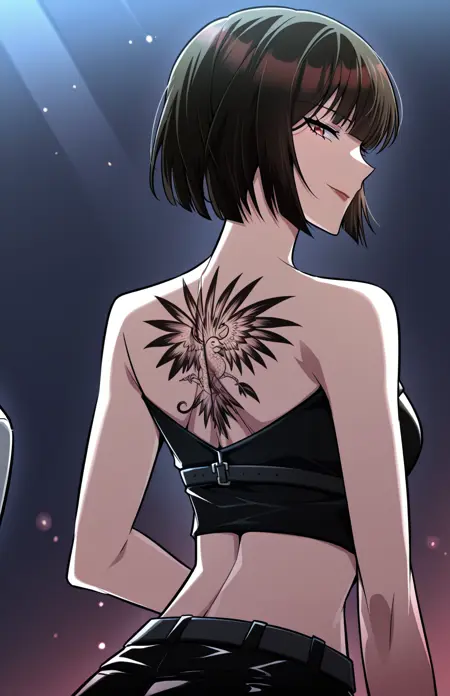 Marcia2, 1명의 소녀, 혼자, 붉은 눈, 단발, 어두운 갈색 머리, 곧은 앞머리, 약간 불규칙한 앞머리, 등에 문신,