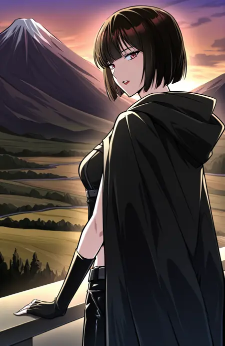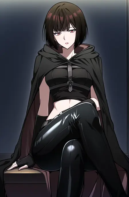 Marcia1_아웃핏, 검은 후ood 달린 망토, 검은 크롭탑, 가슴 하네스, 복부, 검은 긴 손가락 없는 장갑, 검은 가죽 바지, 더블 벨트, 검은 허벅지 높이 부츠,