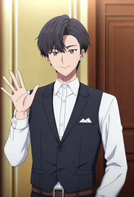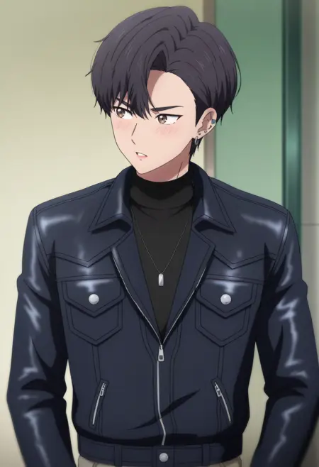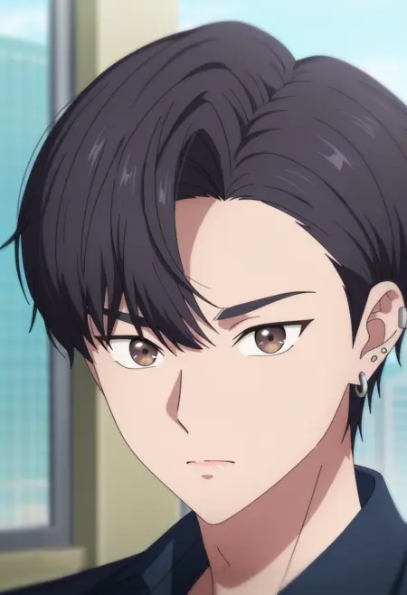 han seojun, black hair, brown eyes, short hair, swept bangs
