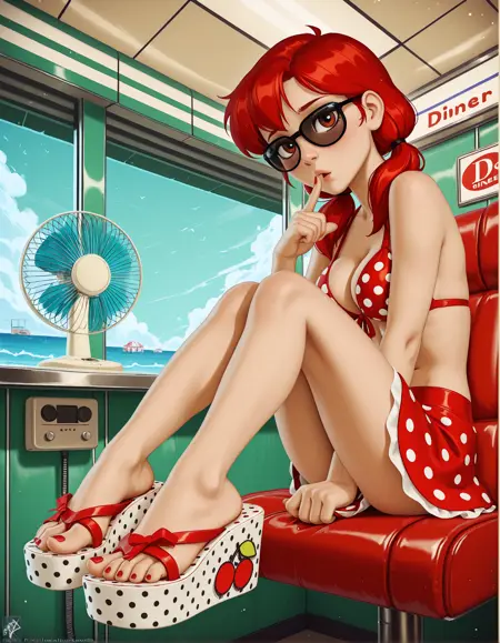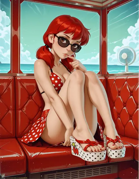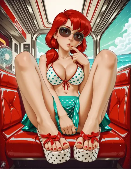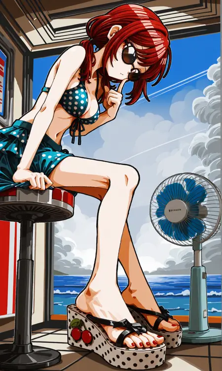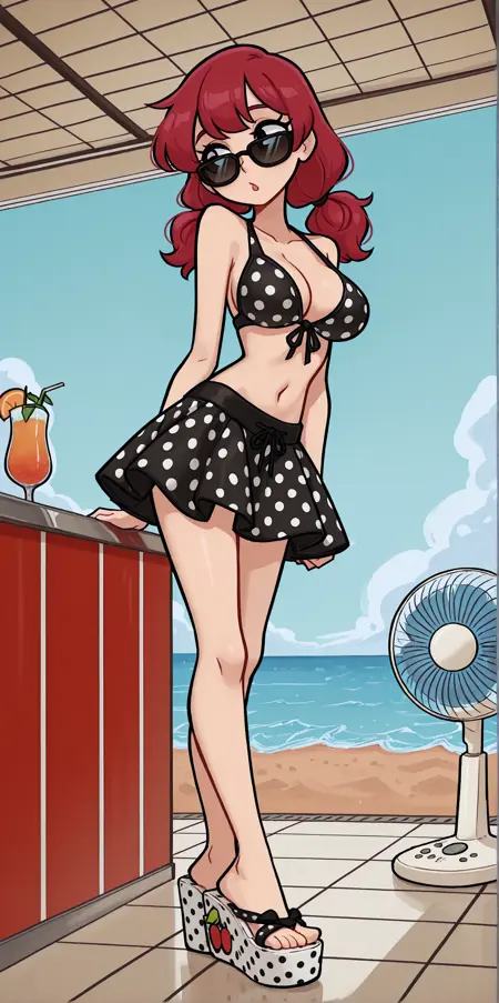 발등에 추가 스트랩이 달린 플립플랍 샌들로, 체리 무늬가 있는 점무늬 웨지 위에 리본 bows가 장식되어 있습니다.