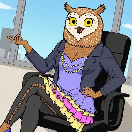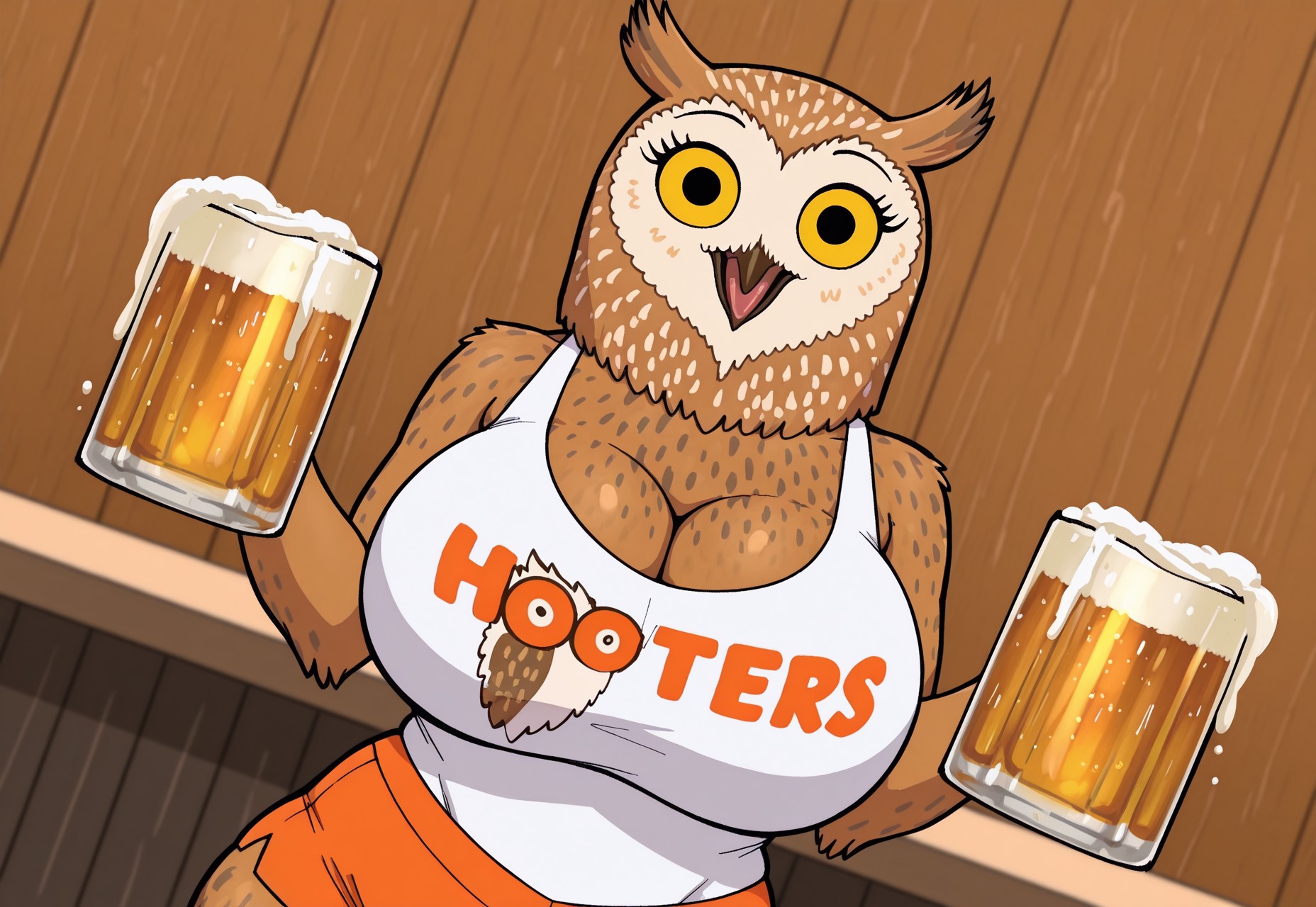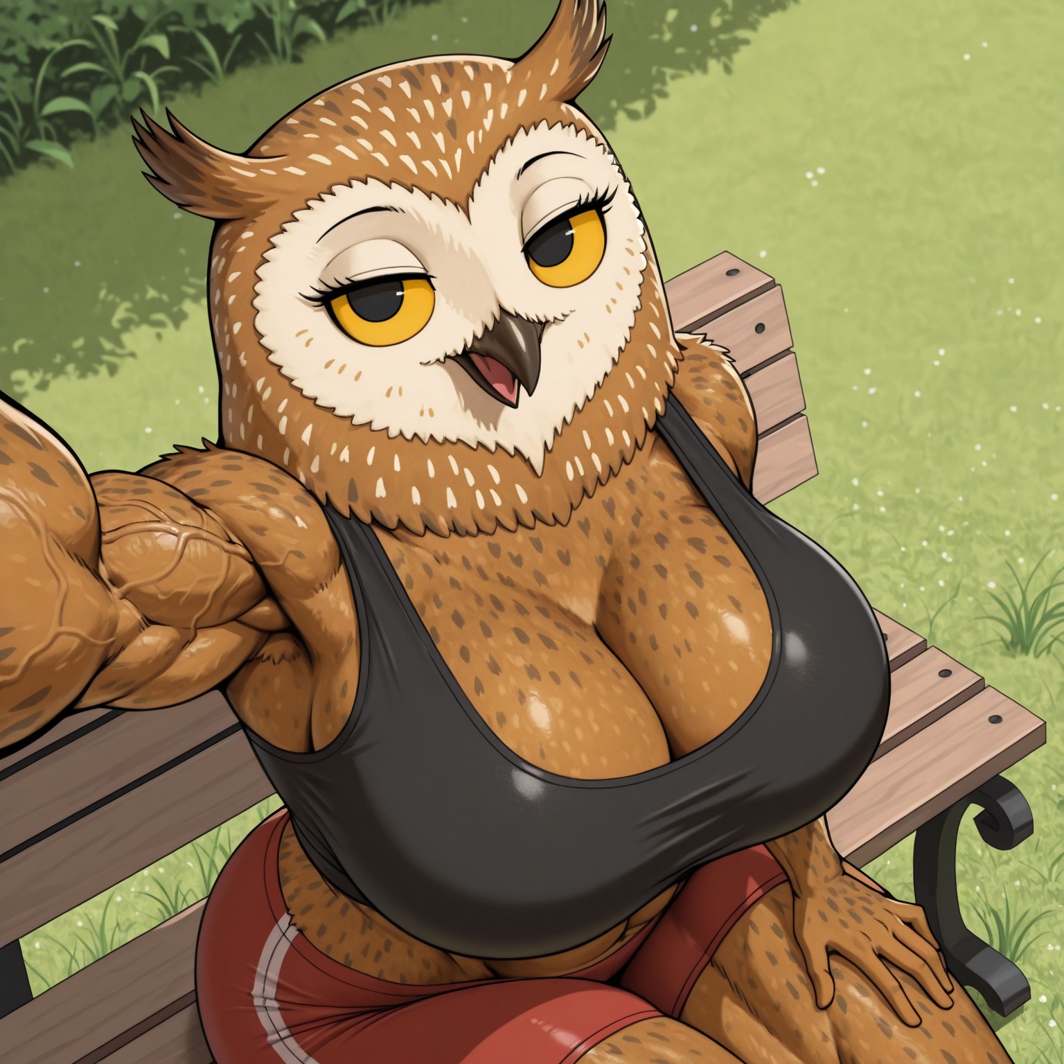 긍정적 프롬프트: WandaBH, 털복숭이 여성, 앤트로, 조류, 올빼미, 검은 눈썹, 가늘고 긴 눈썹, 노란 공막, 검은 눈, 동공 없음, 어두운 갈색 부리, 갈색 몸통, 갈색 깃털, 작은 가슴