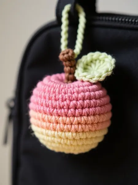 手作りの編み物フルーツペンダント、柔らかいラインと明るい色合いが、バッグに温かみを加える。