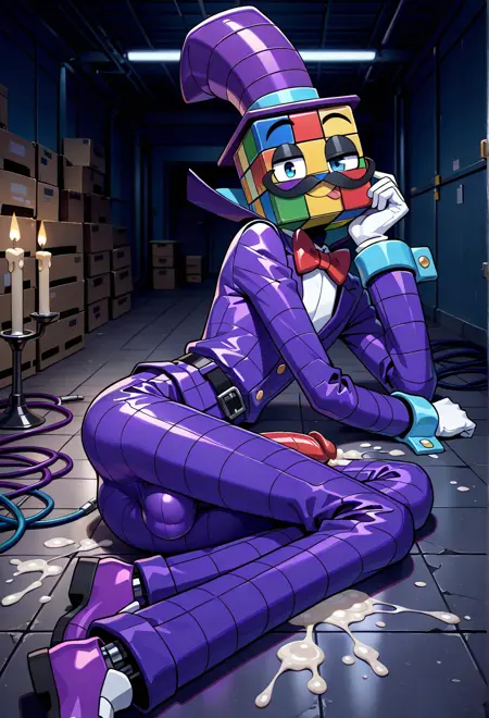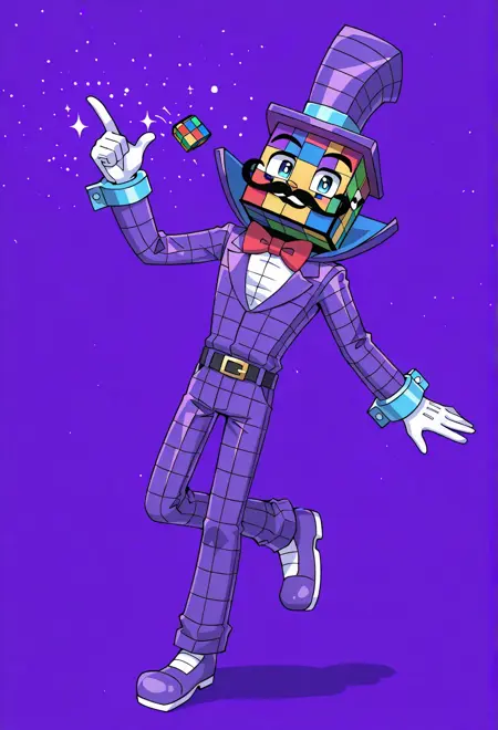 | Trained Words | KazamFAF, 1boy, square rubix cube head with vividly textured squares, blue eyes, short thin long black mustache, purple tophat, purple suit, white shirt, large red bowtie, purple body, white gloves with blue cuffs, black belt, purple pants, white-purple shoes, blocky aesthetic,Copied! |