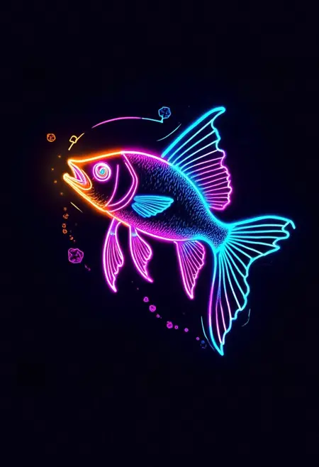 Neon - colored glowing lines outline a swimming fish, glowing fins and body, vivid shades, dark sea, representing aquatic grace.