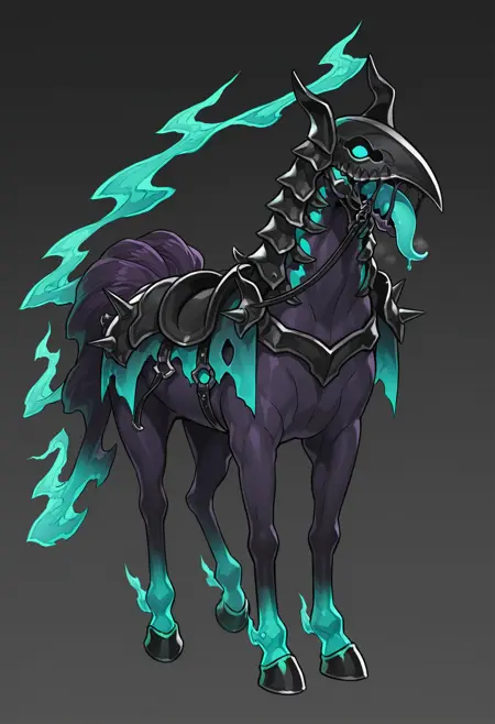 dark purple horse, horseback riding, black barding, black saddle, large scythe, holding scythe