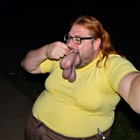 원한다면 "플래시 사진: 뚱뚱한 아빠가 작고 노란색의 조임 터틀넥과 진한 갈색 팬티를 입고, 붉은 머리에 긴 포니테일, 두꺼운 안경을 쓰고 손가락을 핥으며 미소 짓고 있으며, 야간에 플래시를 켜고 촬영한 저품질 2004년 폴라로이드 카메라 이미지. 뚱뚱한 남자의 입에서 길고 끈적거리는 scroat이 밖으로 늘어져 있고, 비정상적이고 거북한 성인 남성. 땀 자국과 흙 얼룩진 손"이라는 프롬프트도 시도해볼 수 있습니다.