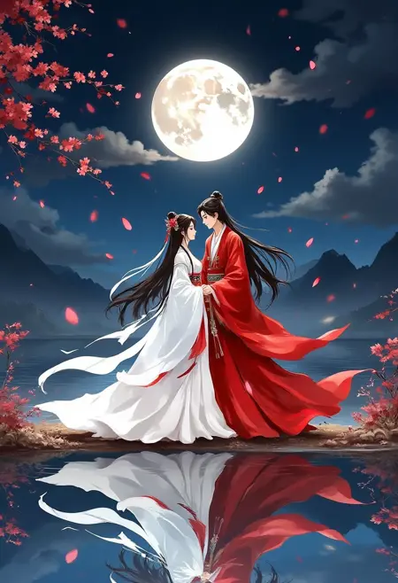 古代衣装の夫婦イラスト、月明かりの湖畔で、二人の姿が水面に映り、赤と白の服、花びらが舞い落ちる、詩的でロマンチックな瞬間。