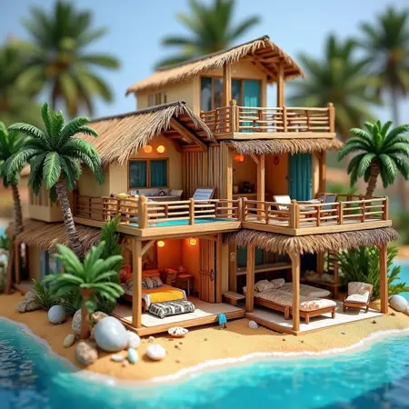 ミニチュア建築モデル、熱帯ビーチの小屋、ヤシの葉の屋根、開放的な空間、砂の床、貝殻の装飾、海が見えるバルコニー。