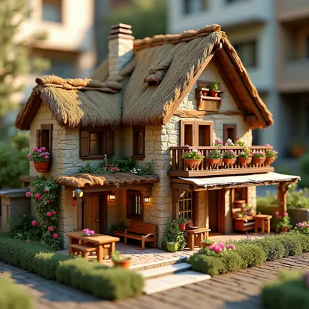 ミニチュア建築モデル、ヨーロッパ風村のコテージ、石造りの壁、わら葺きの屋根、花で満開の花壇、レトロな家具、柔らかな日差し。