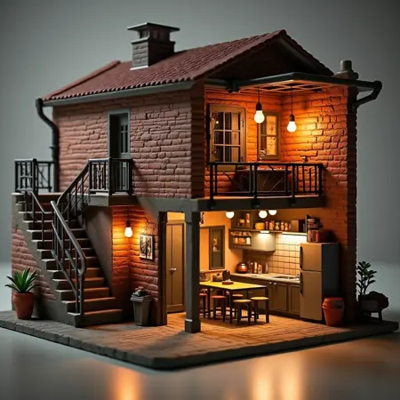 ミニチュア建築モデル、工業風ロフト、露出した煉瓦、金属の配管、コンクリート床、エディソン電球、ヴィンテージ家具。