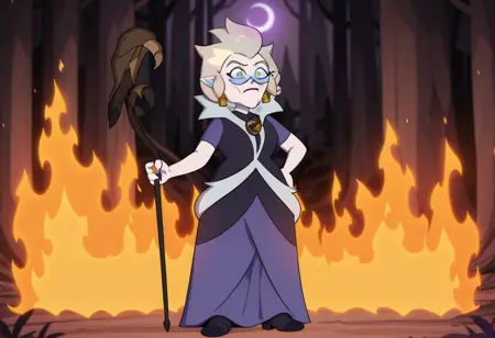 Gwendolyn Clawthorne, elderly, pointy ears, pale skin, violet-colored lower lip, light gray hair, olive-green eyes, long violet nails,