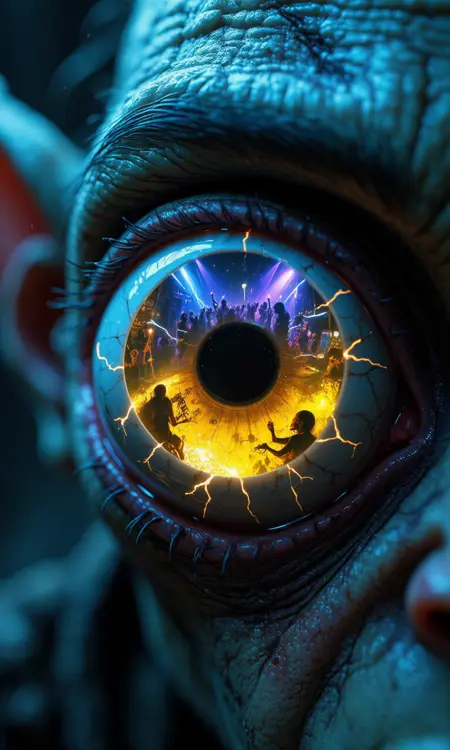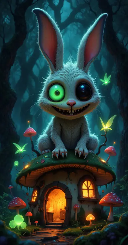 ファンタジー、ユーモア、不気味な魅力を融合させた物語的シーン。