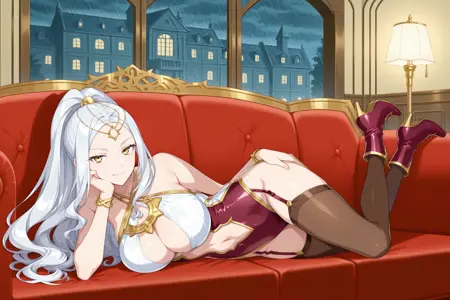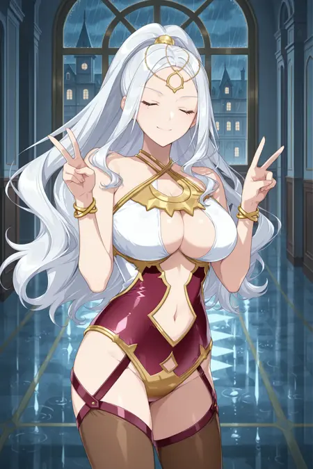 衣装:金の輪飾り、多色のレオタード、白いレオタード、チェリー色のレオタード、胸元の切り替え、へそ切り替え、金の縁取り、金のクロスハーラー、裸の肩、袖なしのレオタード、金のジュエリー、金のブレスレット、茶色のハイソックス、チェリー色のガーターストラップ、短いチェリー色のブーツ、ハイヒール、