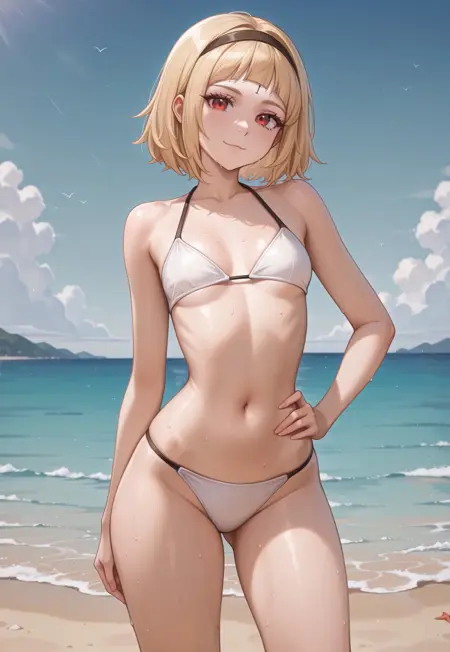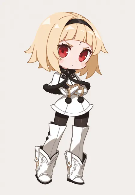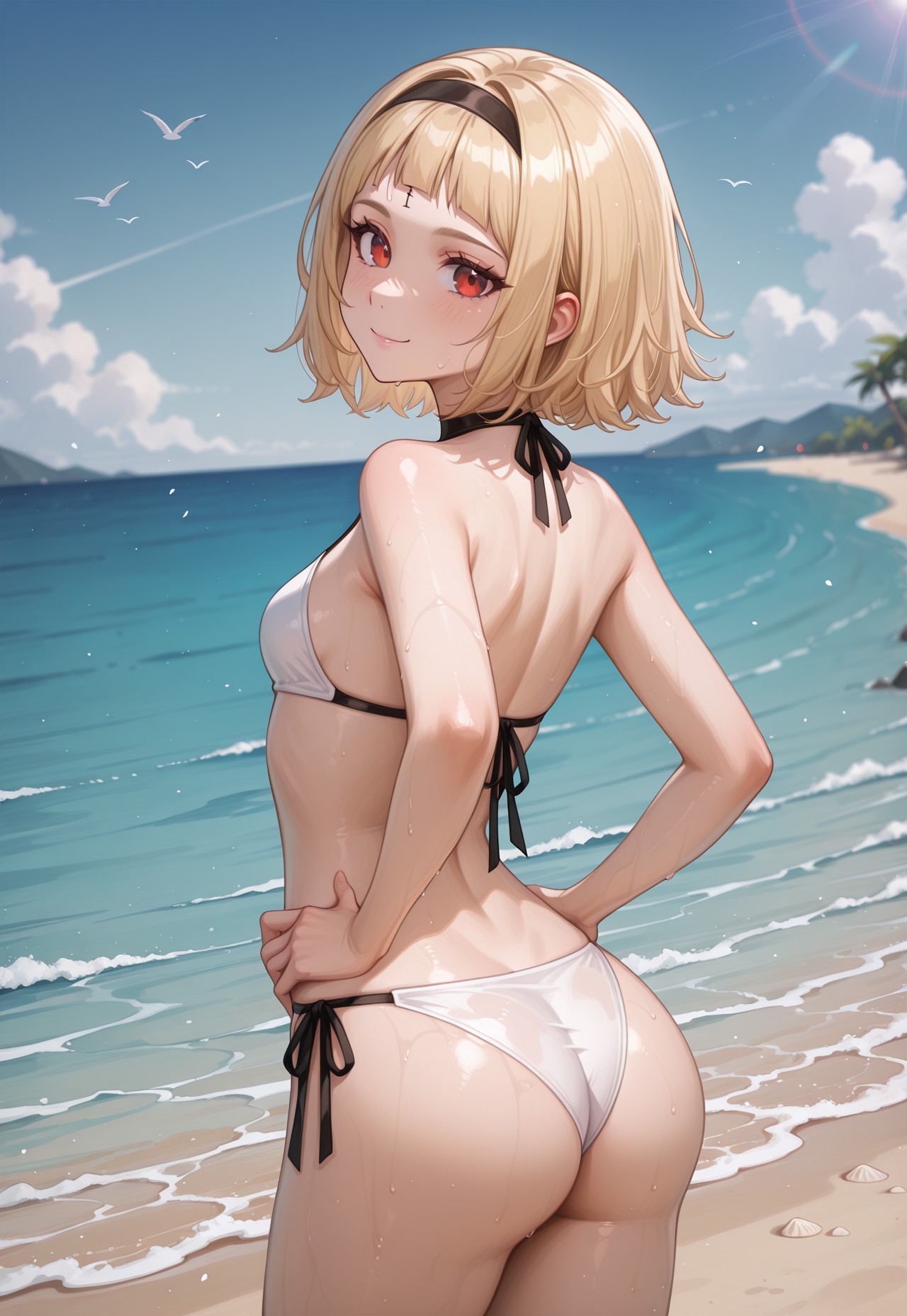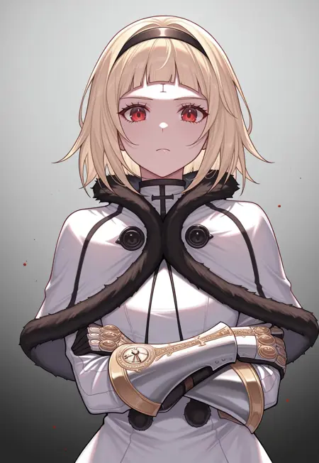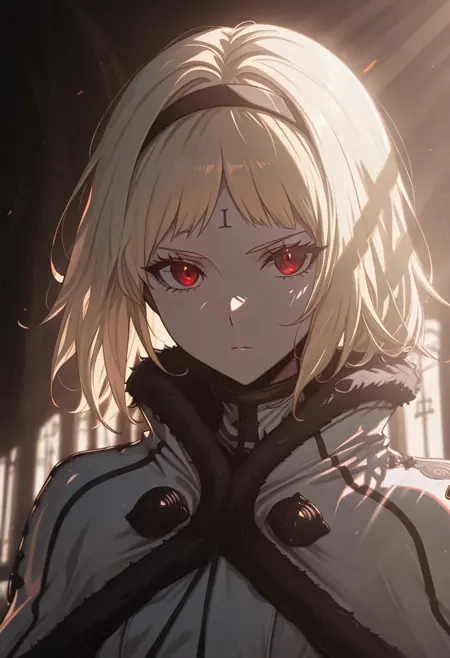 onesdxl1111, one, red eyes, blonde hair, hairband, short hair, mark on the forehead, roman numeral