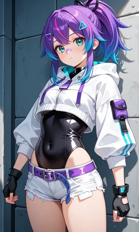 马尾辫,创可贴,脸上有创可贴,鼻子上有创可贴,腰带,黑色手套,黑色紧身衣,蓝色腰带,牛仔布,牛仔短裤,露指手套,手套,帽兜,帽兜下垂,连帽夹克,夹克,紧身衣,紫色腰带,超短裤,短裤,白色帽兜,白色夹克,白色短裤,