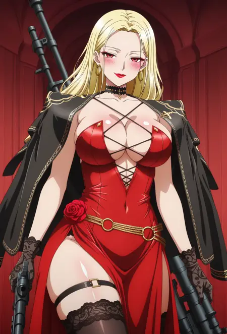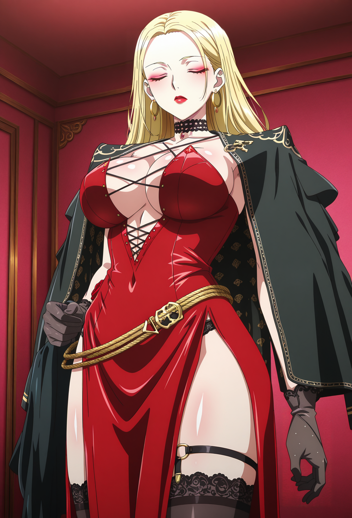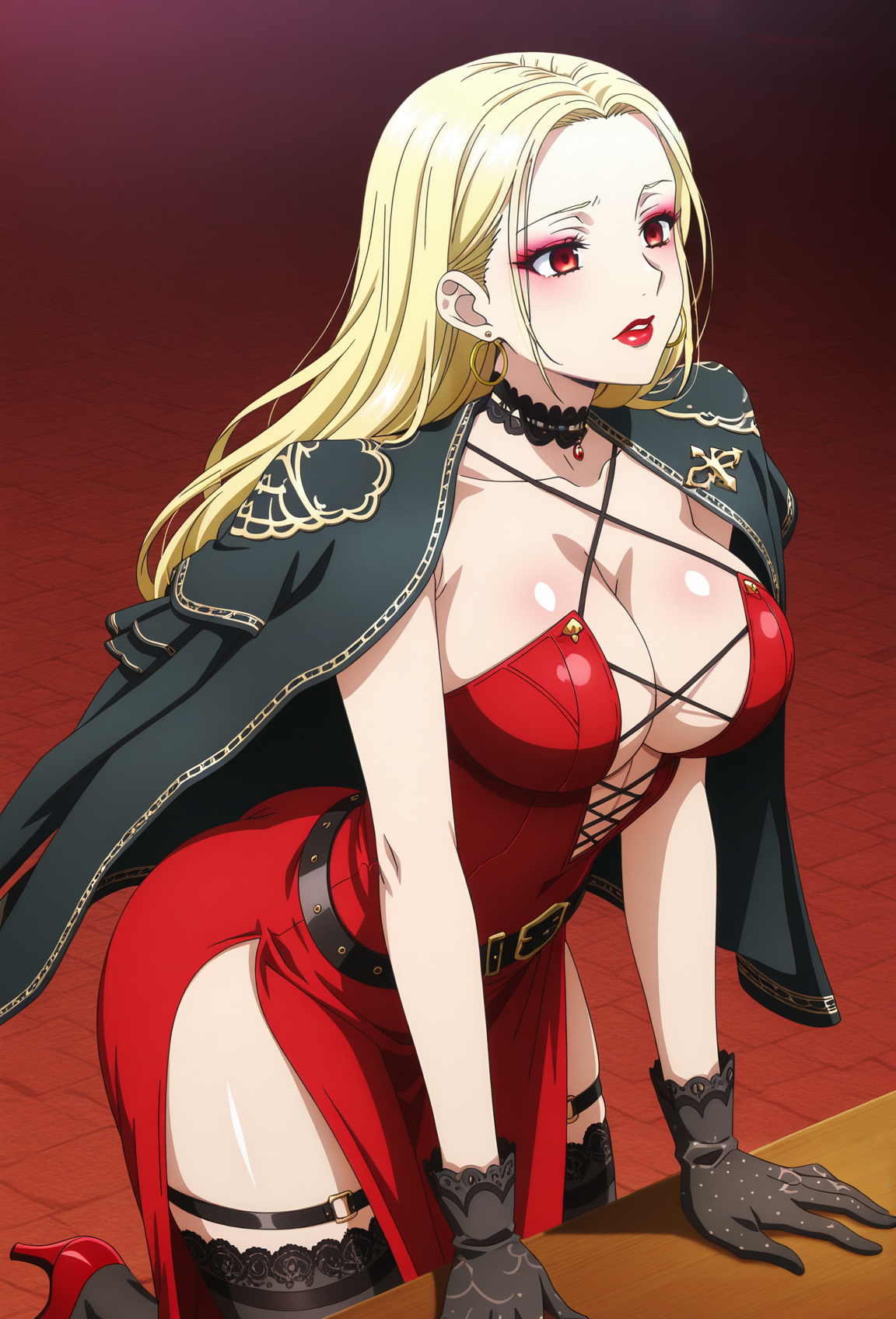 karmen_(granado_espada), 1girl, solo, 成熟した女性, 金髪, 長い髪, 前髪, 赤い唇, 化粧, 大きな胸, 大きなお尻, 赤いドレス, 黒いジャケット, 肩にかけたジャケット, 黒いチョーカー, ピアス, ループピアス, 肩にかけたコート, 黒い手袋, 手袋, チョーカー, ベルト, 太ももストラップ, レッグハイ, 黒いレッグハイ, 胸元, ジュエリー, ジャケット, ハイヒール, 赤い靴, リップスティック, レーストリム, レース, サイドスリット, レーストリム付きの脚部, 花
