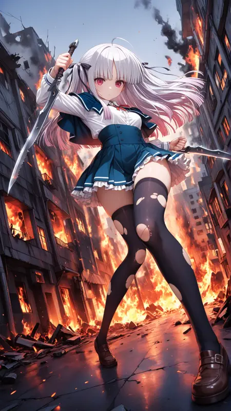 外見: 1girl、長い髪、白髪、前髪、まっすぐな前髪、紫の目、小さな胸、両側を上げた髪、あほ毛、