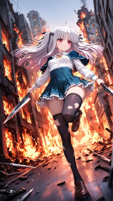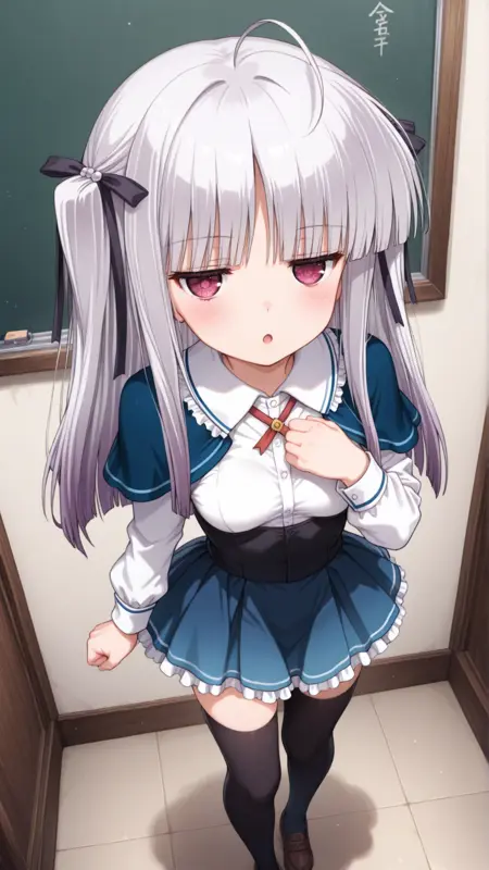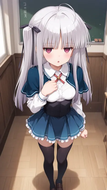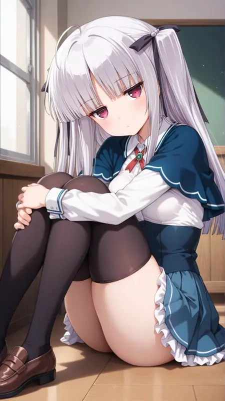 学校制服: 学校制服、シャツ、白いシャツ、長袖、衿付きシャツ、カペレット、青いカペレット、フリルスカート、リボン、髪のリボン、黒いリボン、 bow、髪のボウ、髪飾り、スカート、プリーツスカート、ミニスカート、青いスカート、タイツ、黒いタイツ、靴、