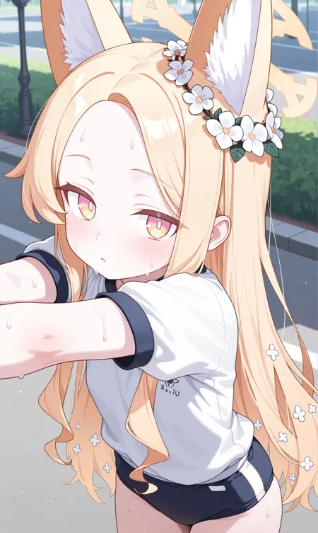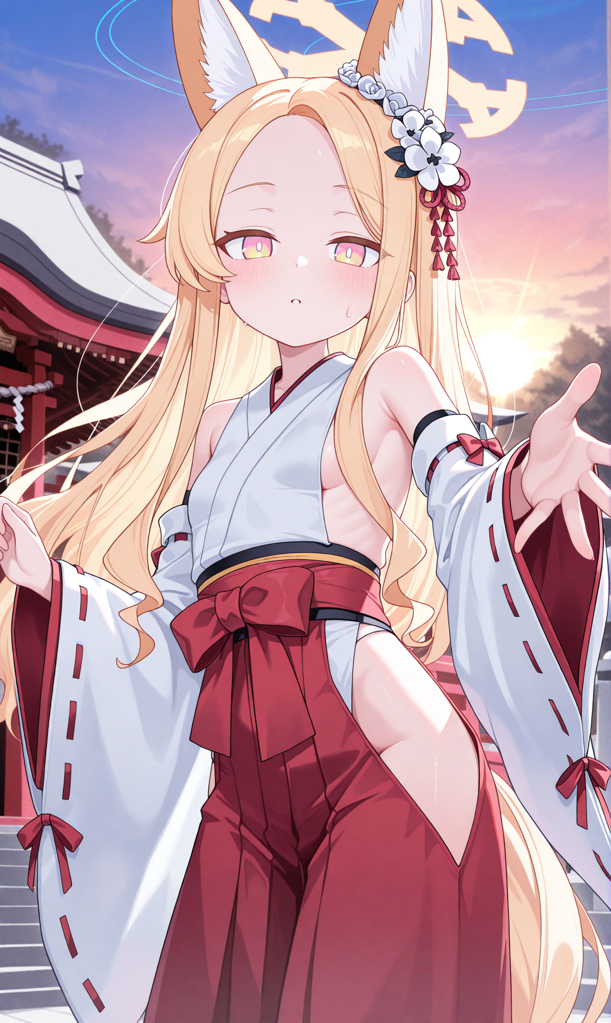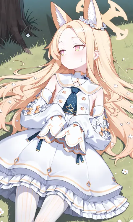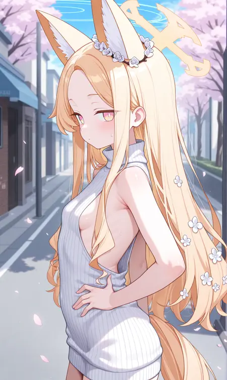 seia (blue archive)、オレンジ色の目、前髪、分け目のある前髪、明るい瞳、金髪、とても長い髪、キツネの耳、髪飾り、髪の花、黄色いハロー、多色の目、グラデーションの目