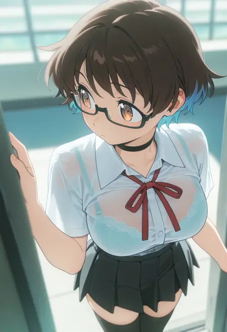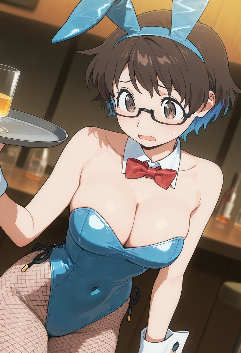 Tags for her look: 1girl, solo, large breasts, short hair, brown hair, brown eyes, blue hair, two-tone hair, semi-rimless eyewear, black-framed eyewear, under-rim eyewear, colored inner hair,