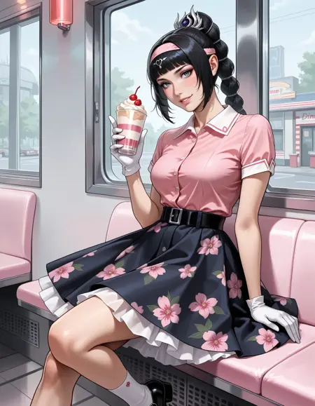 使用以下关键词调用:shirt, skirt, underskirt, voluminous skirt, crinoline, belt, short sleeves, shirt collar, vintage hair, socks, mary janes, gloves