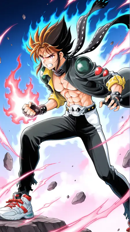 外观:多彩头发,尖刺头发,棕色头发,黑色头发,双色头发,腹肌,红色眼睛,额头有疤痕,