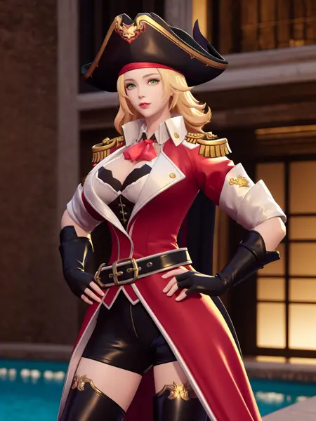 - WZRYyujiJLBXJ, 1girl, solo, blonde hair, fingerless gloves, black gloves, green eyes, pirate hat, belt, epaulettes, breasts, looking at viewer, black shorts, ascot, thigh boots, long hair, hat feather, parted lips,coat, medium breasts,night, mature female, cityscape, pool, hand on hip,