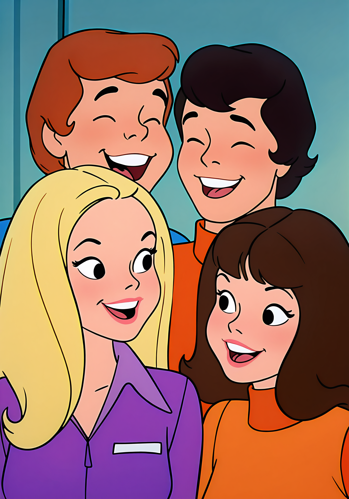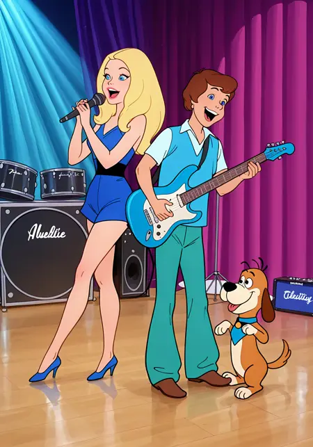 1960年代から1970年代にかけてのハンナ・バーベラスタイルの一般的なスタイルで学習されました。若者たちとおもしろい犬が、世界中を旅しながら音楽を演奏し、謎を解いていきます。おなじみのパターンですね。