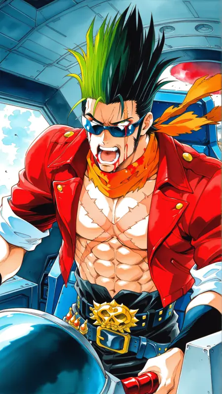 外見:多色の髪、緑の髪、黒の髪、筋肉質、腹筋、成熟した男性、トゲトゲの髪、ツートーンの髪、顔に傷、男らしさ、目の横に傷