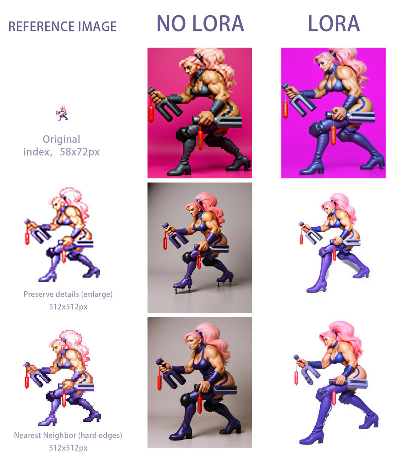 The original image's transparent channel is purple in indexed color, so the Kontext image has a slightly photographic and figurine-like texture. This LoRa will try to adhere to the original image's color scheme, even if it doesn't appear natural.