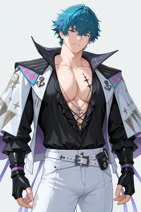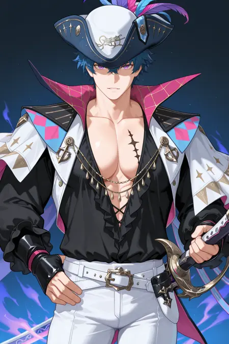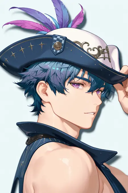 hat,hat feather,black shirt,jacket,long sleeves,fingerless gloves,belt,white pants