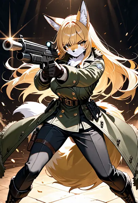 | 训练词汇 | ration01, anthro, furry face, facial fur, fox ears, white inner ears, golden brown fur, long blond hair, swept bangs, black eyelashes, black nose, white neck fur, long bushy tail with light tip, green fur-lined military coat, black leather gloves, dark pants, knee-high black boots, side holsters, tactical bel已复制! |