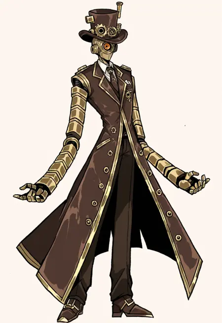 steampunk, humanoid robot, one-eyed, orange eye, mechanical arms, long arms, brown top hat, white shirt, brown necktie, brown coat, long coat, brown pants, brown footwear