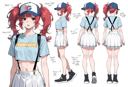 Sport Outfit: twintails,side ponytail,long hair,bangs,hat,skirt,suspenders,midriff,short sleeves,shirt,baseball cap,pleated skirt,crop top,cropped shirt,suspender skirt,miniskirt,blue shirt,white skirt