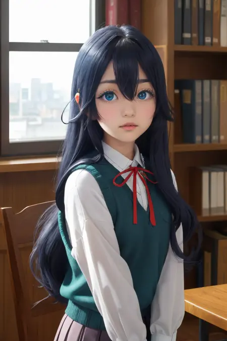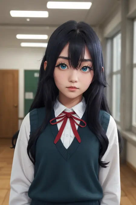 吉本静香,1女孩,单独,长发,看着观众,脸红,蓝眼睛,裙子,衬衫,黑发,长袖,丝带,针织背心,非常长的头发,校服,站立,全身,白衬衫,鞋子,袜子,红丝带,颈带,棕色鞋履,白袜,乐福鞋,臂章